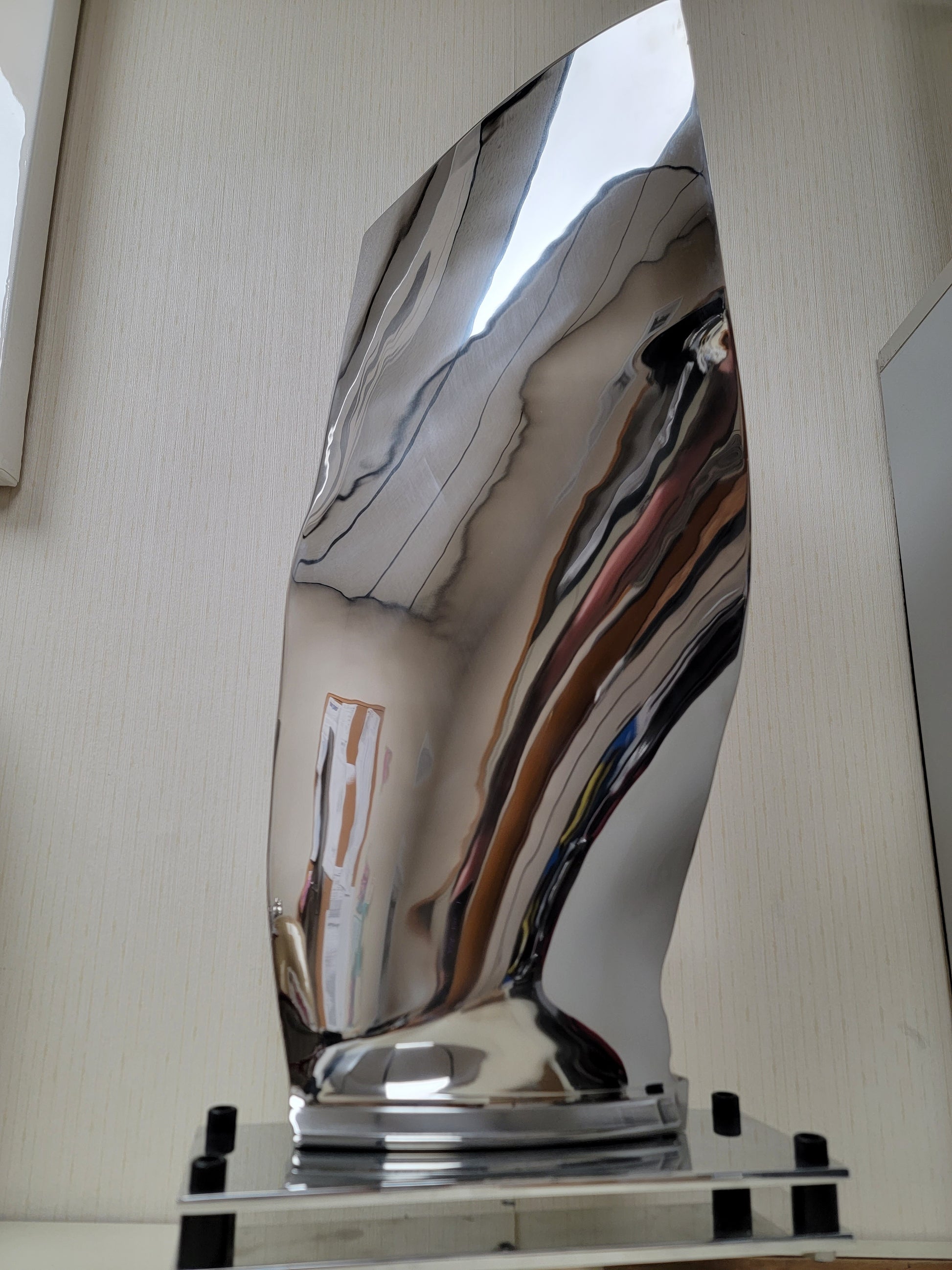 Measuring over 23 inches tall this titanium statue is made from a 100% genuine CFM56 stage 1 titanium jet engine blade from the Boeing 737. The intricate mirror polished double layered base with black bolts adds a unique contrast to this exquisite piece.